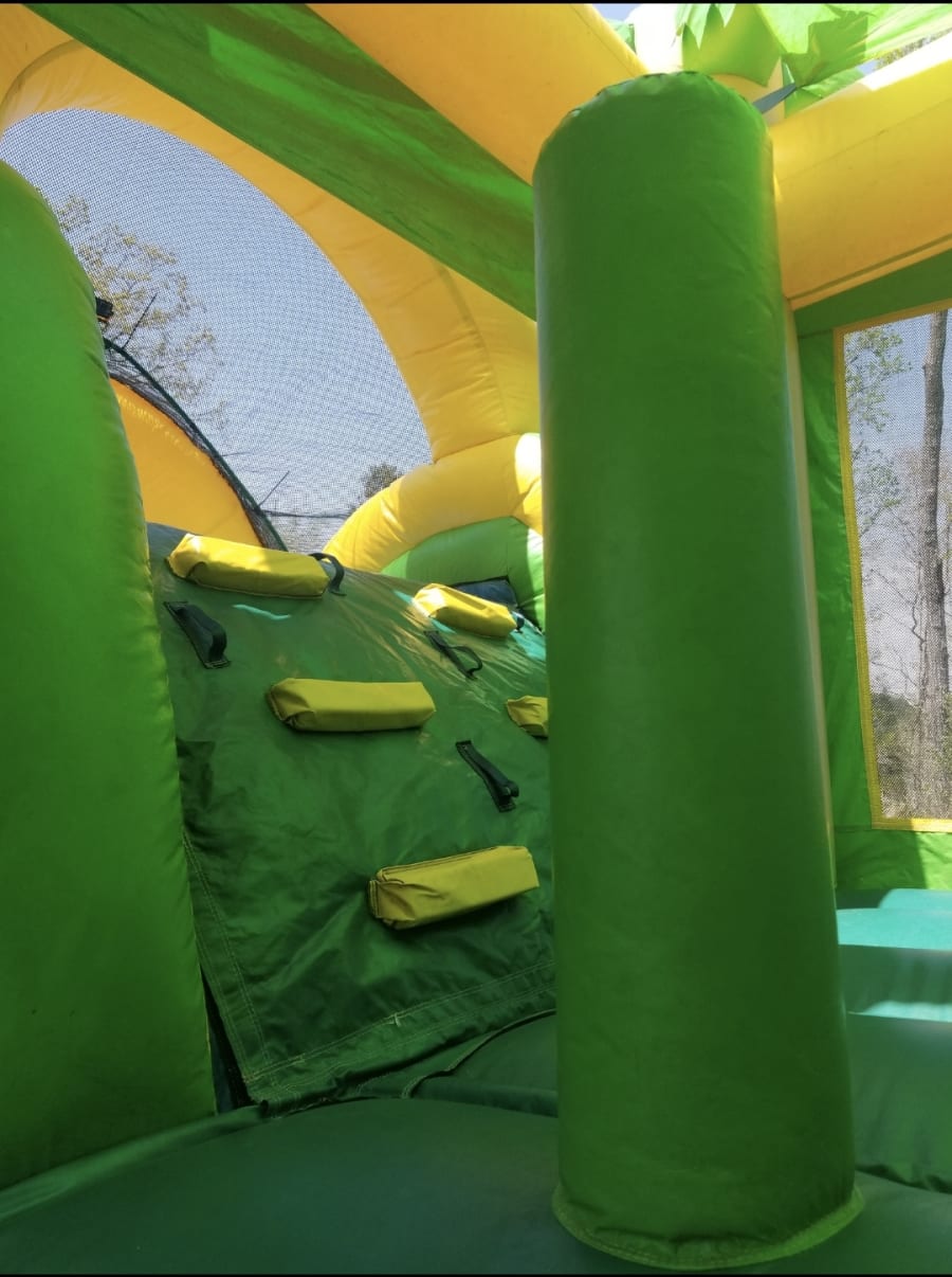 -This Tropical bounce house combo will provide hours of tropical themed fun! Bounce, climb and play in this vibrant green and yellow bounce house/slide combo. It can be used wet to cool down in the Summer heat or also used as dry for sliding fun!