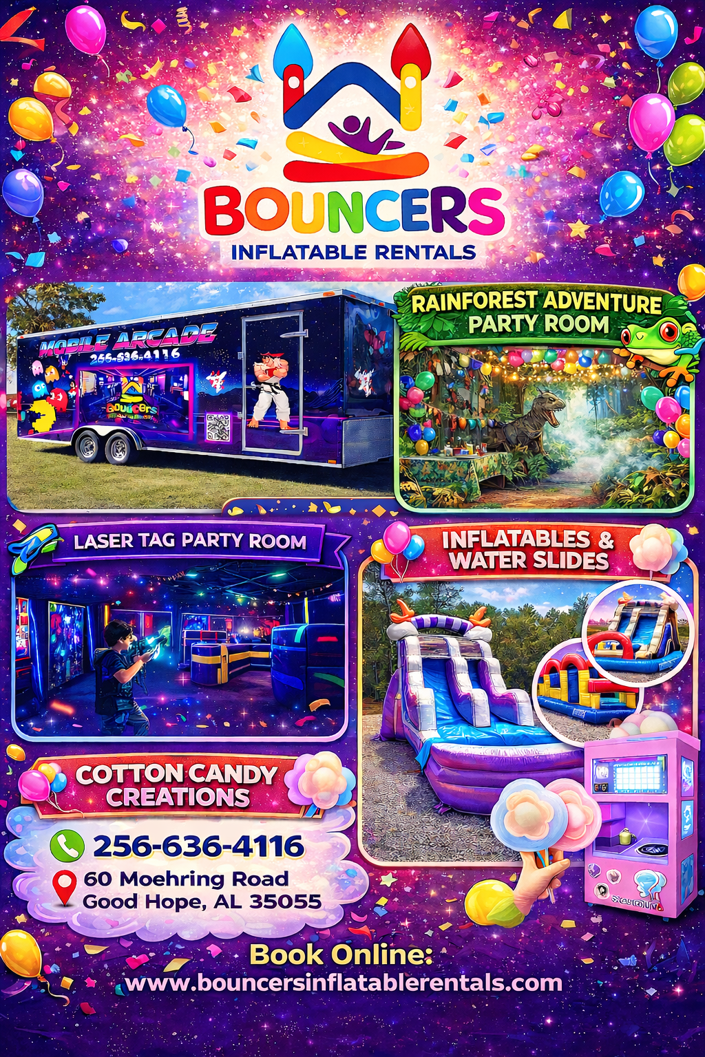 If you're searching for kids activities in Cullman Alabama, Bouncers Inflatable Rentals offers exciting entertainment options including inflatables, laser tag, mobile arcade gaming, and themed party rooms.